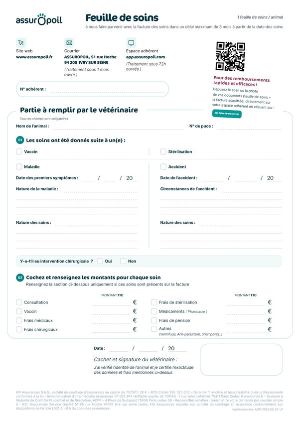 - Faites remplir la feuille de soins par le vétérinaire de votre choix.