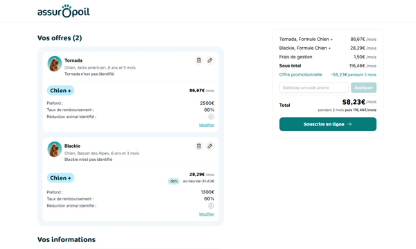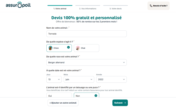 Assur O’Poil encourage les foyers multi-animaux avec des remises : 10 % dès le deuxième animal, et 15 % à partir du cinquième.
