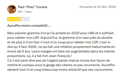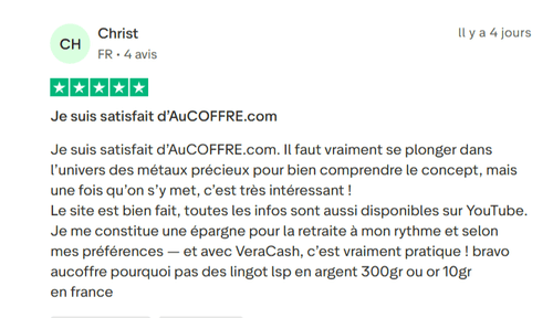AuCoffre est clairement l’une des références les plus sérieuses pour investir dans les métaux précieux en France. Son système d’épargne (LSP), la diversité de ses offres, sa certification ISO 9001 et ses coffres sécurisés inspirent confiance.