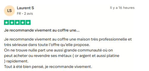 Les clients saluent une offre complète et bien pensée pour l’achat, la vente et la conservation de métaux précieux (or, argent, platine). Beaucoup apprécient la simplicité d’utilisation du site et la possibilité d’investir à son rythme.