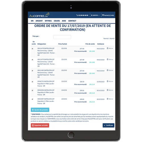 Seules les pièces achetées sur la plateforme peuvent être revendues, qu’elles soient stockées en coffre ou livrées à domicile. La revente des pièces stockées en coffre est instantanée (en quelques clics), tandis que celle des pièces livrées à domicile est plus longue.