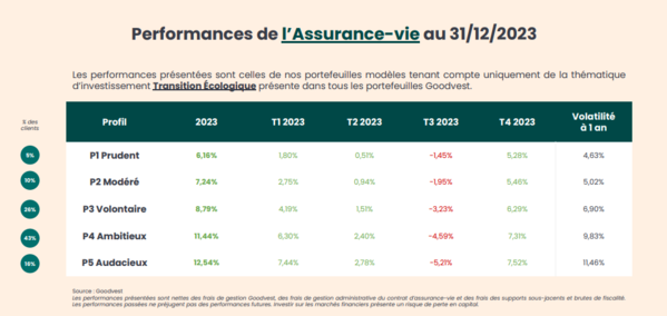 | Rendement moyen assurance-vie au 31/12/23 – profil | Prudent : 6.16 % net Modéré : 7.24 % net Volontaire : 8.79 % net Ambitieux : 11.44 % net Audacieux : 12.54 % net |