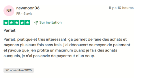 Nous apprécions la clarté des échéances et les rappels réguliers qui facilitent la gestion des remboursements. Nous conseillons toutefois d’utiliser ces solutions uniquement si vos finances sont stables et si vous pouvez régler chaque échéance à temps.