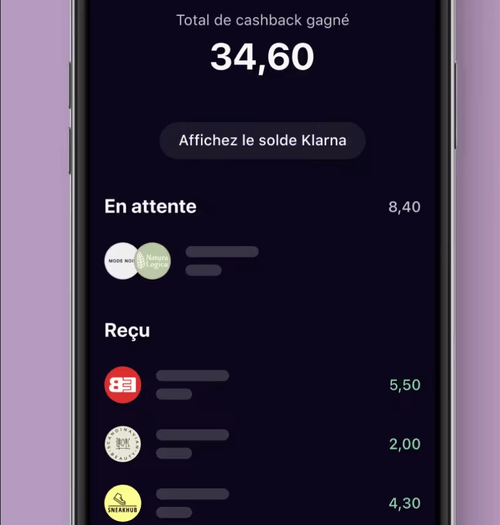 - Recevoir votre cashback, avec un retour pouvant atteindre 10 % dans l’application Klarna