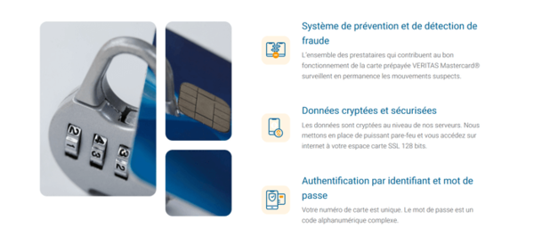 Veritas protège vos achats en ligne avec la technologie 3D Secure, la double authentification par identifiant et mot de passe. Vos données sont cryptées lors des transmissions et vos informations personnelles sécurisées sur des serveurs protégés. Ils identifient vos lieux de connexions et vous alertent en cas de fraude ou de connexions suspectes. Vous pouvez également bloquer/débloquer votre carte en un clic depuis l’espace client en cas de perte ou de vol.