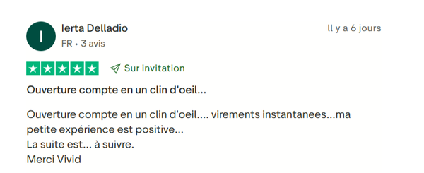Les avis positifs sur Vivid Money soulignent surtout la simplicité d’utilisation, la rapidité d’ouverture de compte et la fluidité de l’application. Les utilisateurs apprécient un service jugé fiable, clair et pratique, avec une interface moderne qui facilite la gestion bancaire au quotidien.