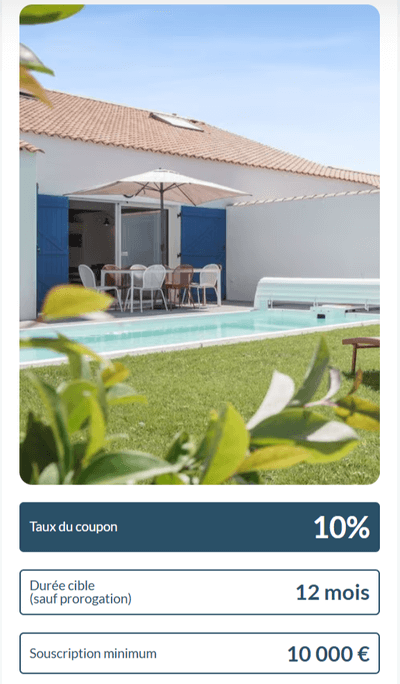 Le courtier vous propose jusqu’à 10 % de remise sur le SCPI Club Deal Immobilier Sables d’Olonne. Il vous suffit de souscrire avec ce lien une émission obligataire de 10 000 euros sur 12 mois pour profiter de cette remise. Vous pouvez ainsi acquérir l’usufruit temporaire de 54 villas Pierre & Vacances aux Sables d’Olonne, avec un remboursement prévu grâce aux loyers nets estimés à 5,4 M€.