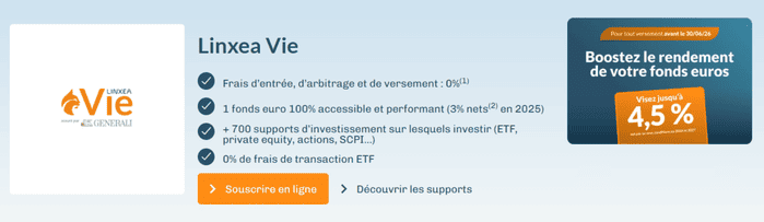 Linxea Vie est un contrat d’assurance-vie distribué par LINXEA et assuré par Generali. Avec plus de 730 supports disponibles, il permet d’investir sur des ETF, des SCPI, des actions, du private equity et des fonds immobiliers. Les frais d’entrée, d’arbitrage et de versement sont inexistants, à l’exception des SCPI, SCI, ETF et actions.