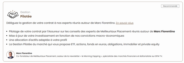 La gestion pilotée s’adresse aux épargnants qui souhaitent déléguer leurs investissements. Des professionnels ajustent l’allocation d’actifs selon le profil de risque. Deux contrats de la gamme Meilleurtaux proposent cette option :