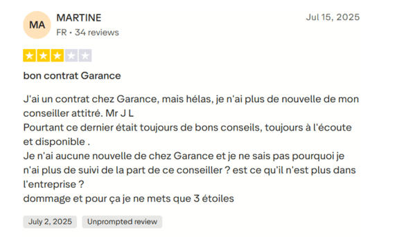 Les avis positifs mettent en avant le rendement jugé excellent du fonds en euros. Les clients apprécient le contact humain avec leur conseiller, et la valeur ajoutée des services innovants comme Cagn’up pour épargner sans effort. Pour ces utilisateurs, Garance a su tenir ses promesses.