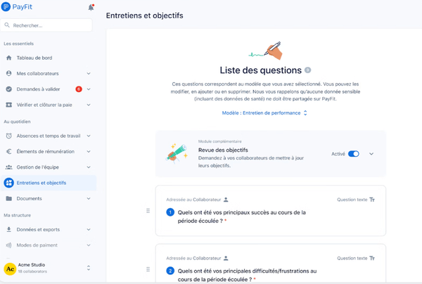 PayFit vous accompagne dans l’organisation de vos campagnes d’entretiens annuels et professionnels. Vous créez vos propres trames à partir de modèles déjà prêts et adaptez chaque campagne à vos besoins. Les managers et les collaborateurs peuvent ensuite remplir leurs questionnaires en ligne, puis partager leurs retours depuis leur espace personnel.