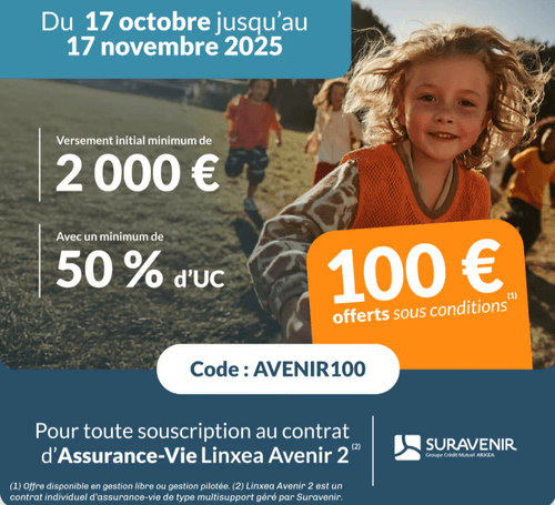 Entre le 17 octobre et le 17 novembre 2025, Linxea vous réserve une prime de 100 € pour toute souscription en ligne au contrat Linxea Avenir 2 au nom de votre enfant. Pour en bénéficier, il suffit d’effectuer un premier versement de 2 000 € ou plus, en gestion libre ou pilotée, dont au moins 50 % investis en unités de compte (non garanties en capital).